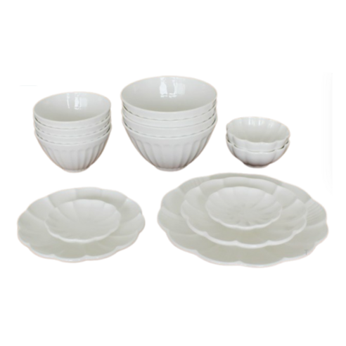 플라워 가든 4인 식기홈세트라 그릇 모양이 정말 꽃 모양 같이 예뻐요. 재질은 도자기이며 화이트 색상이라 제일 기본적이면서도, 무난하고 깔끔한 식기류입니다.