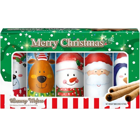 크리스마스 분위기가 물씬 풍기는 캐릭터가 있는 틴 디자인에 웨이퍼 과자가 들어있어요