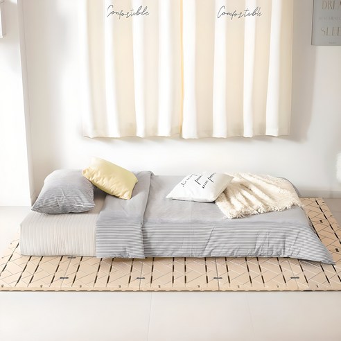 매트리스만 깔아서 사용하면 온도 차이로 습해져서 매트, 바닥에 곰팡이 생기거든요~ 나무 판때기나 알뜨리 같은 매트리스 받침대가 꼭 필요해요!!