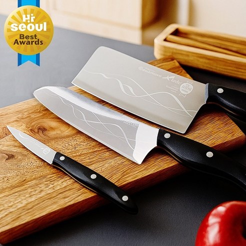 빌리빈 스테인리스 주방칼 3종 세트는 감각적인 디자인과 고강도 스테인리스 재질 그리고 우수한 절삭력을 가진 식도, 산도쿠, 과도 3종 세트입니다.