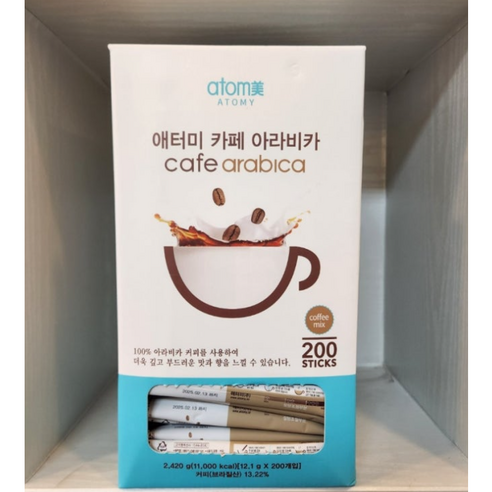 애터미 카페 아라비카 커피믹스 50개입 2개 커피 스틱이 100개 들었어요 아라비아 커피를 사용해서 믹스커피 중에서는 젤 맛있는거 같아요 원두맛이 더 느껴지는 커피 맛이 더 진한편인데 깊고 부드러운 맛과 향이 좋아 자주 주문하네요 애터미 언니에게 구입을 하다가 팡에서도 판매 하는것을 보고 편하게 주문해서 받으니 좋네요