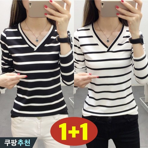 (특가상품) 빅사이즈 1+1 날씬해보이는 여성 단가라 브이넥 긴팔 티셔츠 가을 겨울 클래식 배색 줄무늬 슬림핏 간절기 이너 큰옷 여성의류 2xl 3xl 아르코 데일리 여자 티 2P