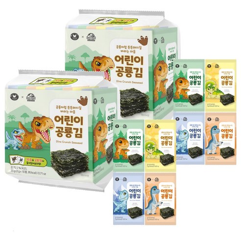 어린이 공룡김은 아이들이 좋아하는 공룡 캐릭터가 패키지 전면에 크게 그려져 있어 눈길을 사로잡는 제품입니다. 국내산 참기름과 들기름을 사용해 더욱 고소하며, 4가지 해조칼슘과 DHA, EPA가 함유되어 있어 영양까지 고려한 제품입니다.