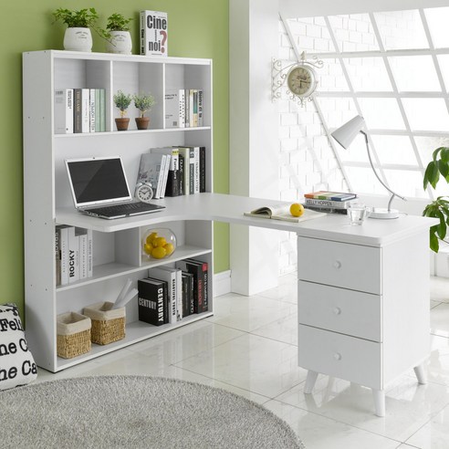 책상에 일체형 선반이 있어 디자인이 예뻤어요. 그리고 책상 테두리나 선반 테두리가 각지지 않고 둥글어서 아이가 사용해도 다치지 않을 것 같았습니다. 색상도 화이트라 깔끔했구요.
