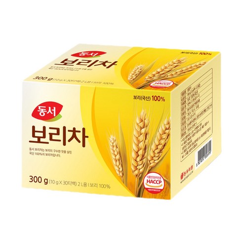 동서 보리차 300g 티백형은 동서식품에서 출시한 식수용 보리차로, 10g씩 개별 포장된 티백 30개로 구성되어 있어 , 총 2리터 기준으로 우려 마시기 적합한 제품이야 . HACCP 인증을 받아 위생적으로 제조되었으며 , 포장재는 폴리프로필렌 코팅 종이로 되어 있어 보관이 용이해 .