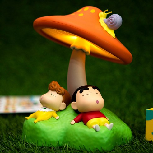 버섯 모양의 무드등 아래 짱구와 짱아가 누워있는 디자인은 귀여워요..!